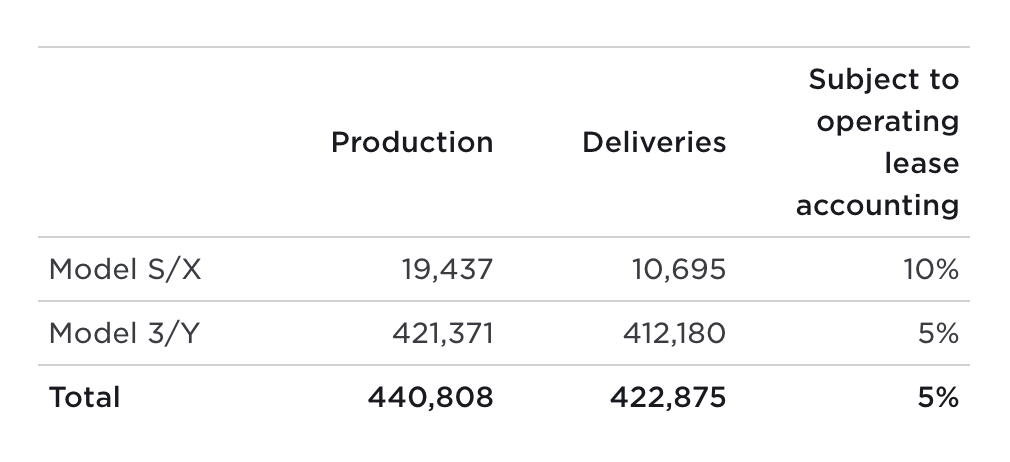 プレスリリースによると、テスラは、Q1では、モデル3とモデルYを412,180 台納車。モデルSとモデルXを10,695台納車。これらのモデルの合計が2021年第3四半期以降で最も低くなっている。