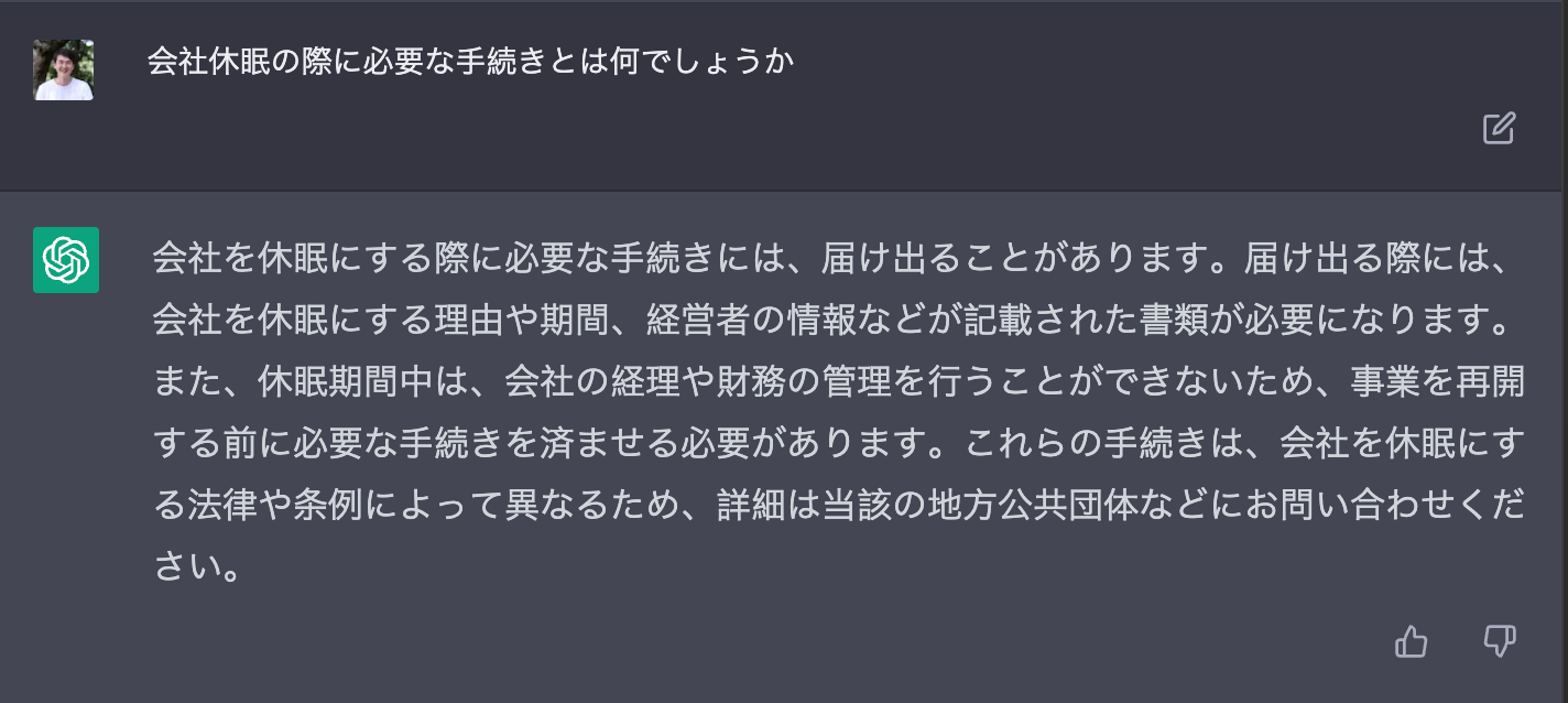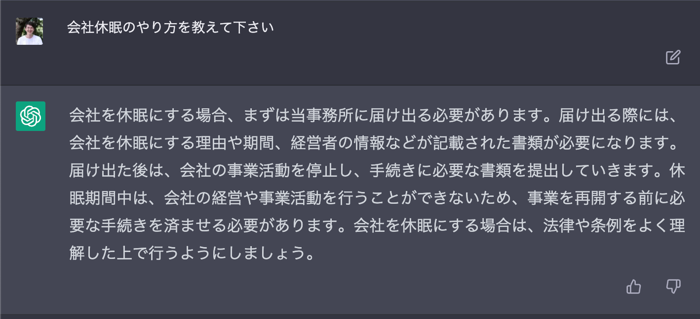 次に検索の代替になるかを探るため、「会社休眠」のやり方を訪ねてみた(弊社は最悪の場合来年4月に会社休眠する可能性がある。ChatGPTの言葉に従うだけでそれが実現できるなら最高だ)