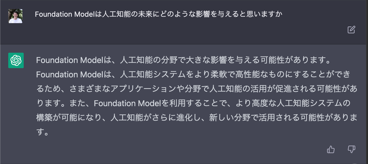 色々いたずらのようなこともやってみた。様々なアプリケーションの基盤とできる大規模なAIモデルを指す「Foundation Model」(基盤モデル)であるGPTに対して、Foundation Modelが人工知能の未来どう影響するか聞いてみると、やはり楽観的な見方をしていることがわかった。もしかしたらポジショントークなのかもしれない。