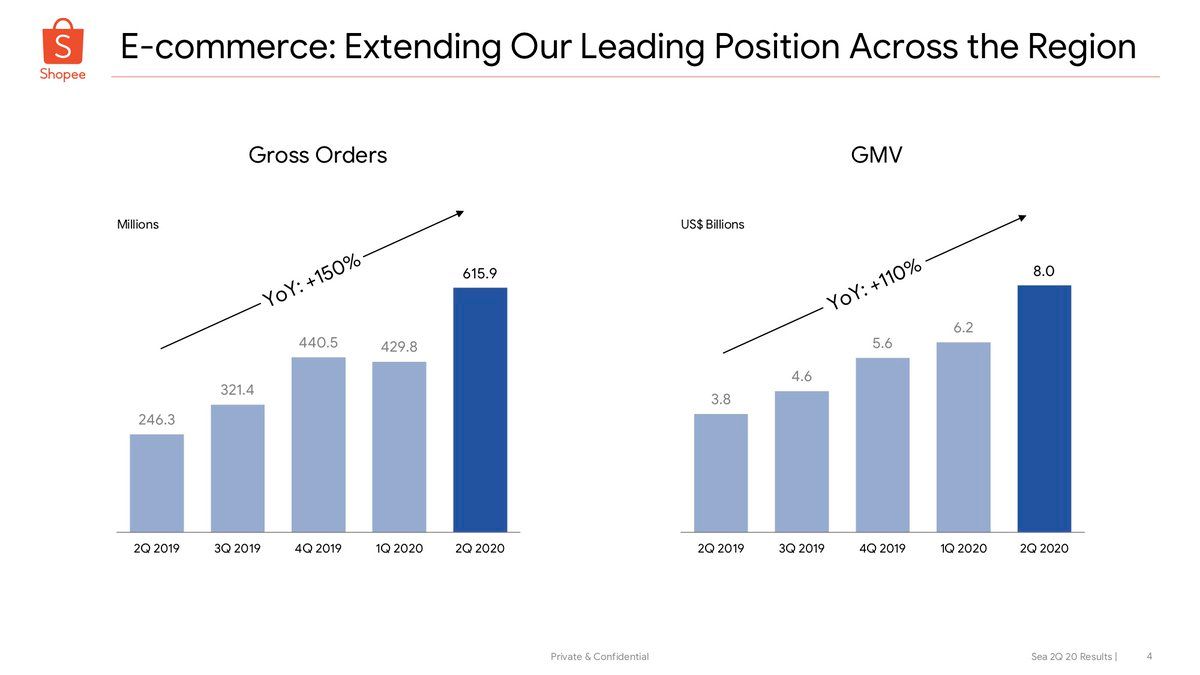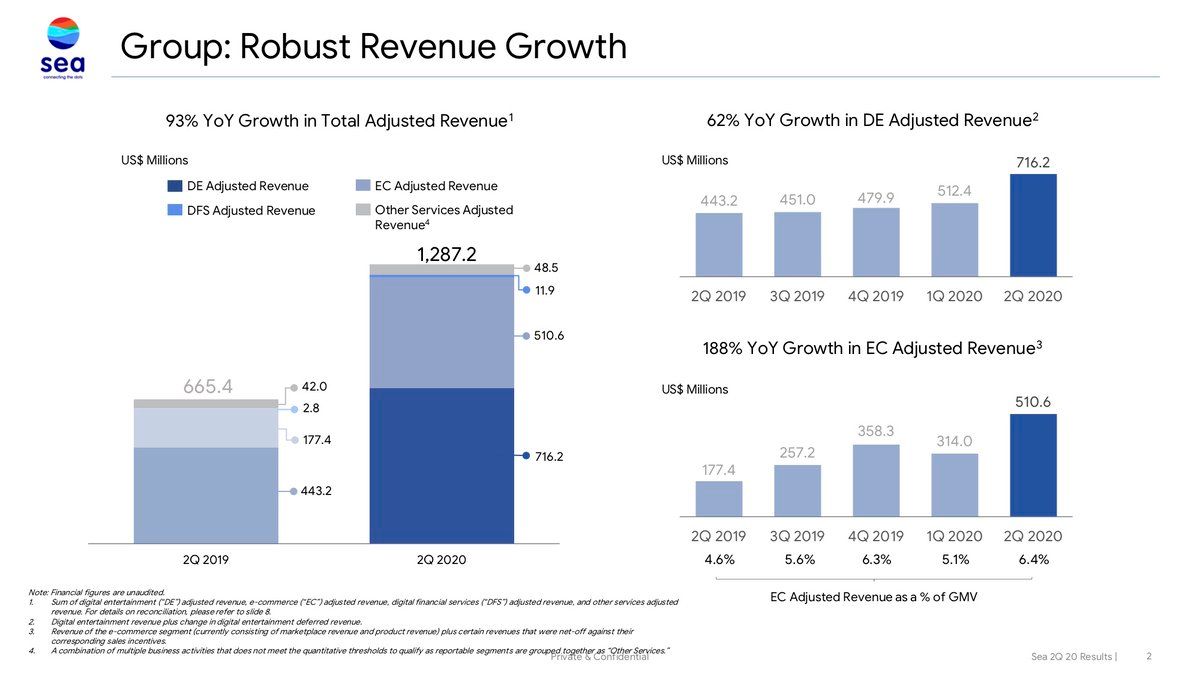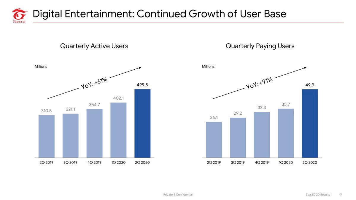 - コロナ禍の勝者。2020年Q2でデジタルエンタテインメント(ゲーム)事業「Garena」のQAUは61%成長。四半期課金ユーザー数は91%成長した。コロナの流行によってゲーム利用が増加したことが反映されたと考えられる。モバイルやゲームカフェでの利用形態に浸透。eSportsの普及にも力を注ぐ。
