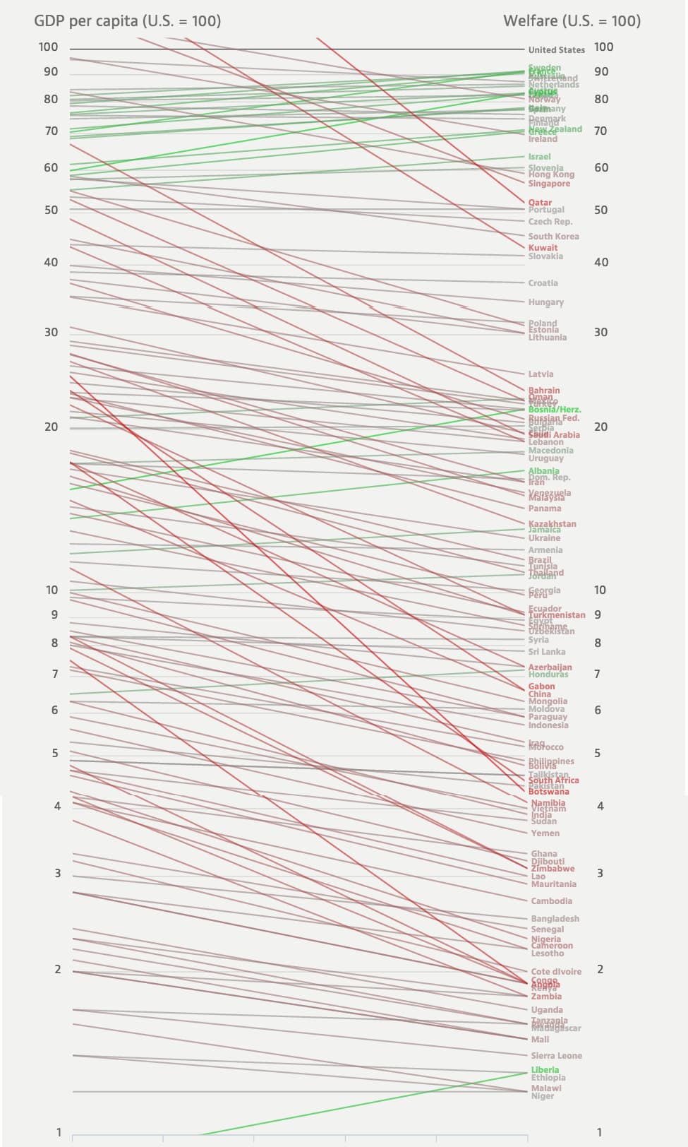 Jonesらは、前出の論文の中で、米国の収入経路に対して標準化された「福祉」(Welfare)と呼ばれる経済的幸福の尺度を開発しました。Jonesらは、国間の不平等、余暇、および平均余命に関する情報を備えた豊富なデータソースを分析し、140か国の福祉スコアを計算しました。次のようになりました。