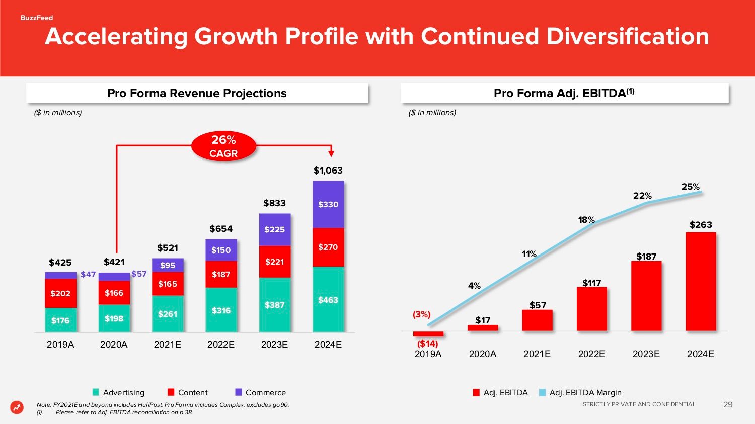 SPACのスポンサーと初期投資家、コンバーティブルノートで融資する投資家に新株を割り当てることになっており、彼らは合併後の会社の27.5%を保有する。BuzzFeedの既存投資家は、合併後の会社の72.5%を保持することとなり、かなり希釈化することになる。買収合併を繰り返してきたにもかかわらず、企業価値が下がり続け、「調整後EBITDA」という怪しげな指標で黒字化を主張するに留まる状況下では、BuzzFeedはこのような不利な取引を受け入れないといけないだろう。