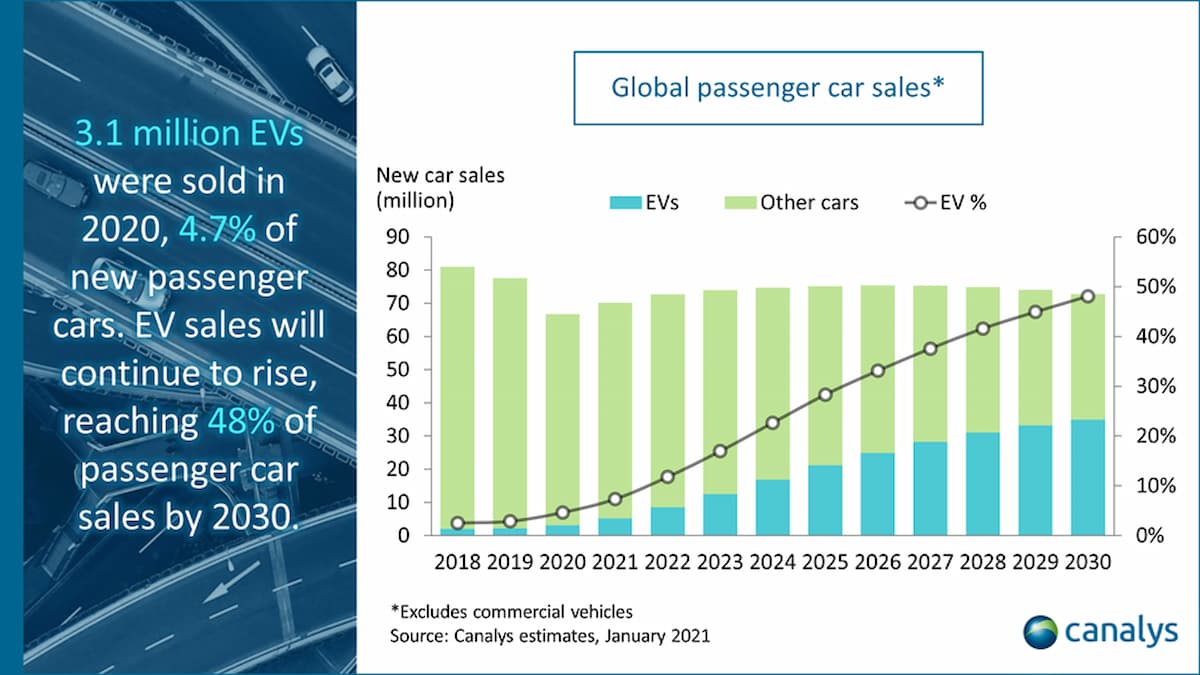 市場調査会社Canalysの新しい調査によると、2020年の電気自動車(EV)の世界販売台数は前年比39%増の310万台となった。これは、2020年の乗用車市場全体の販売台数が14%減少したこと大きく異なるトレンドを示している