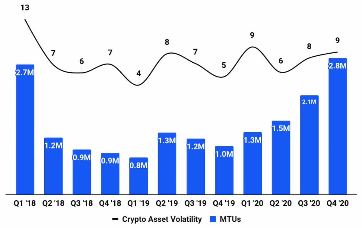 Coinbaseは100万人の月間取引ユーザー(MTU)から5億3370万ドルを生み出した。これは、MTUあたりの年間収益が533.7ドルになる。2020年には、Coinbaseは280万人のMTUから12.8億ドルの収益を得るようになった。