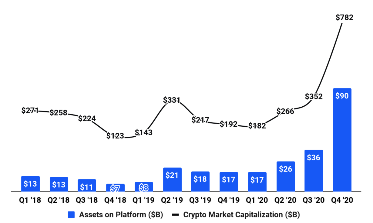 2020年12月31日現在、暗号通貨のプラットフォーム上にある当社のクリプト資産の総額は、クリプト資産の時価総額の11.1%を占め、2019年12月31日および2018年12月31日現在のそれぞれ8.3%および4.5%から増加している。2020年には、当社のプラットフォーム上の資産は当初減少したが、その後、当社がサポートする暗号資産の量、価格、幅の拡大に牽引されて増加した。当社は、当社の製品やサービスのスイートを拡大し、サポートされている暗号資産の数や種類を増やすことで、当社のプラットフォーム上で保有されている暗号資産の量が着実に増加すると予想している。