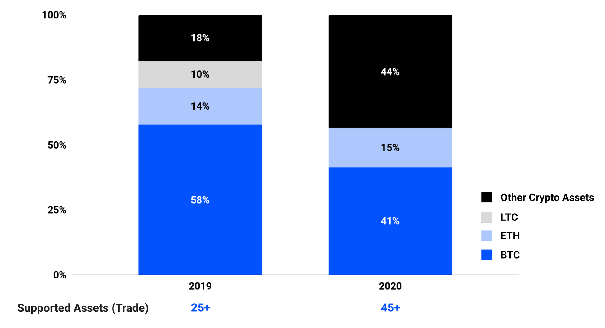 「2020年には、他のcrypto資産が取引量に占める割合が高くなった。この成長は、複数のDeFi資産を含む20以上の暗号資産が追加されたことで、BitcoinとEthereumから離れて取引量が分散したことによるものだ。2019年12月31日に終了した年度中、Bitcoin、Ethereum、Litecoin以外の資産は、個別に当社の取引量または取引収益の10%以上を占めていなかった。2020年12月31日に終了した年度には、ビットコインとイーサリアム以外の資産が、それぞれ当社の取引高または取引収益の10%を超えることはなかった」とCoinbaseは記述している。
