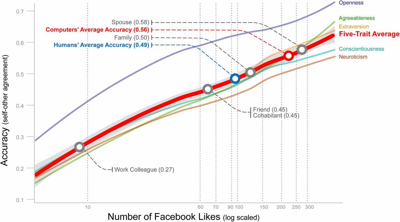 コンピュータベースの人格判断が、人間が行うものよりも正確とする研究が行われた。わずか60のFacebookのいいねであなたの性格を適格に予測できる。