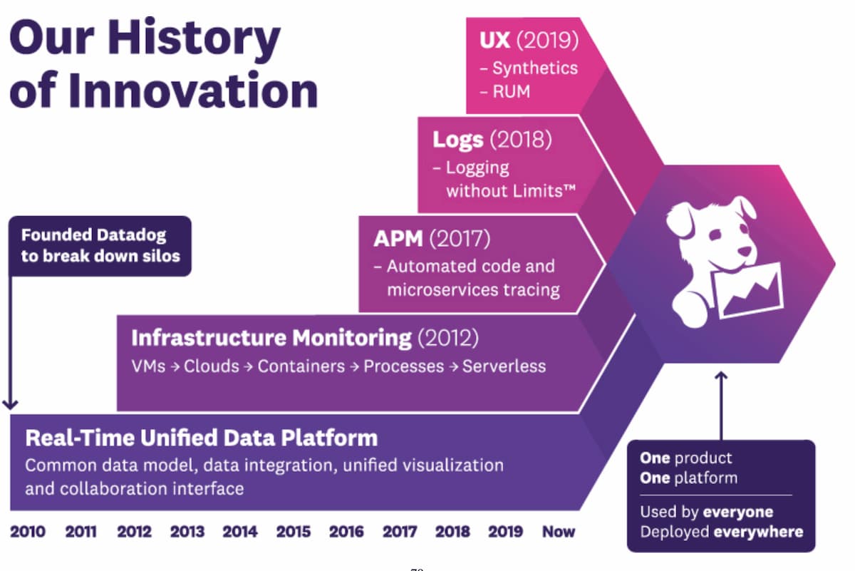 データドッグは2010年に設立され、2012年に初の商用ツールを発表した。同社はインフラストラクチャの監視からスタートし、その後、APM、ロギング、ユーザーアクティビティ、ネットワーク監視、そして最近ではセキュリティへと拡大している。同社のS-1によると、データドッグは「クラウド時代の開発者、IT運用チーム、ビジネスユーザー向けの監視・分析プラットフォーム」を提供している。2018年には、メトリクス、トレース、ログのソリューションを提供し、1つのツールセットで「監視性の3本柱」に取り組む最初の企業であると主張している。