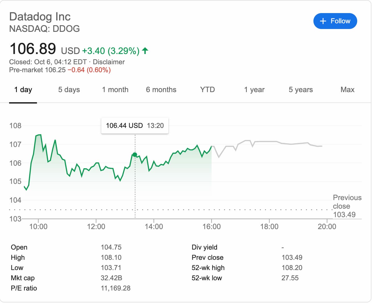 2020年5月頃から好決算などを背景にした株価の急上昇をみており、上昇前と比較すると2倍以上の株価に到達した。現在、データドッグは106ドル前後で取引されている。データドッグは現在、約320億ドルの企業価値に達している。P/Eレシオは11.169。これが過剰評価か否かを決めるのが、今後の製品開発だろう。