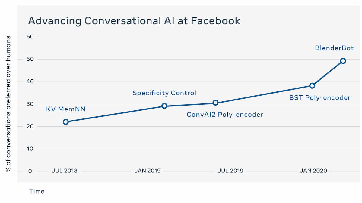 Googleは当時、Meenaが世界最高のチャットボットであると宣言していた。しかし、このFacebook独自のテストでは、人間の評価者の75%がBlenderの方がMeenaよりも魅力的であり、67%がBlenderの方が人間のように聞こえると判断した。また、チャットボットは人間の評価者の49%を騙して、その会話ログの方が実際の人間の会話ログよりも人間らしいと思わせていたが、つまり、両者の間にはあまり質的な違いはなかった。