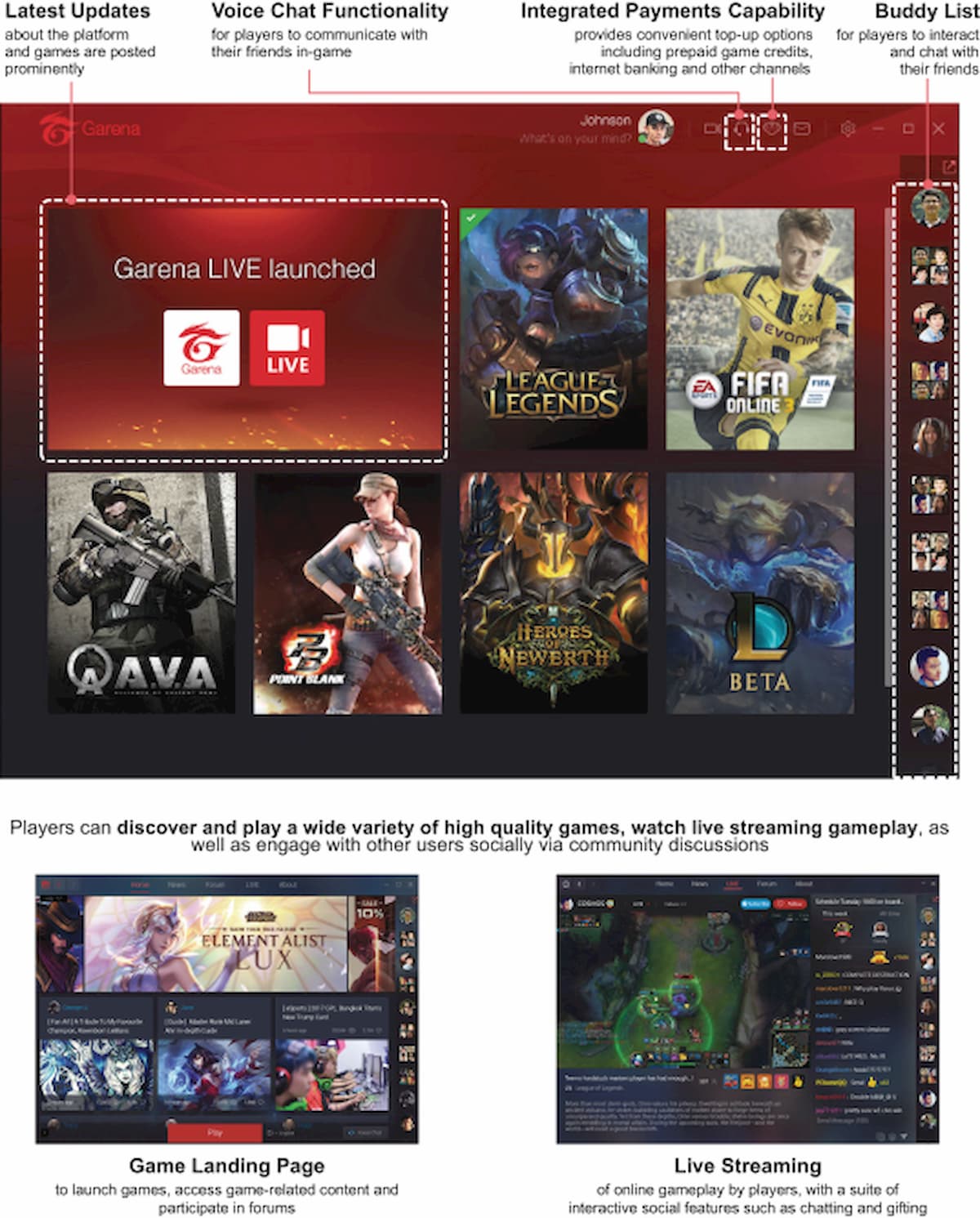 Garenaのデスクトップアプリケーションは、コアなゲームプレイの要件に加えて、プレイヤーのソーシャルなニーズにも対応している。プレイヤーがゲームをプレイしている間にできた友達と連絡を取り合うために、統合されたチャットシステムを提供している。2017年6月30日現在、当社のデスクトップアプリケーションの1日平均アクティブユーザーは、チャットシステムに122人の友人がいた。さらに、2016年12月にタイで、2017年第1四半期に台湾とベトナムでゲームストリーミング機能「Garena LIVE」をデスクトップアプリでリリースした。この機能により、プレイヤーはプレイ中のゲームをリアルタイムで簡単に「garena.live」のWebポータルにストリーミング配信することができる。