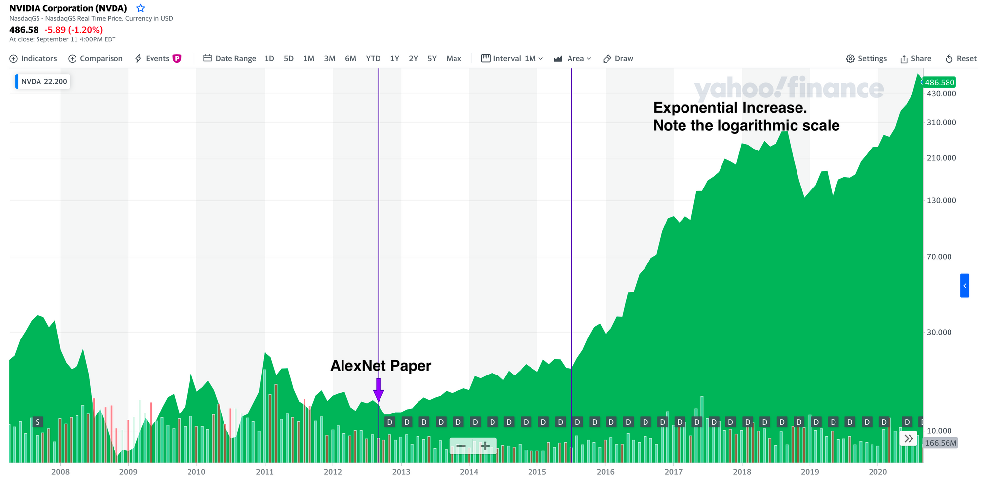 2012年には、トロント大学の大学院生であるAlex Krizhevsky(AlexNetの開発者)がCUDAを使用して、ImageNetのデータセット上に最初の本格的なディープラーニングモデルを作成しまた。ディープラーニングのアイデアは当時としてはそれほど新しいものではなかったが、その機能を実現するために必要な計算能力が不足していたために、実際には普及することはなかった。CUDAによって、Alexは元々ゲーム用に設計された計算能力を利用することができた。この論文は、AIのゲームチェンジャーとなり、現在の革命が始まった。