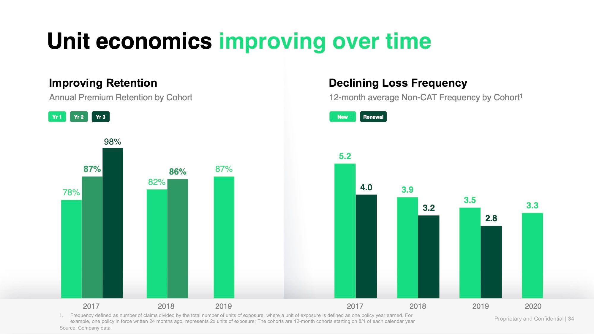 左図は、継続率(Retention Rate)のコーホート分析であり、次第に改善しているのがわかる。右図は損失頻度(Loss Frequency)でこれは減少している。これらが意味することは、HippoではUnit Economisが継続的に改善している、ということだ。