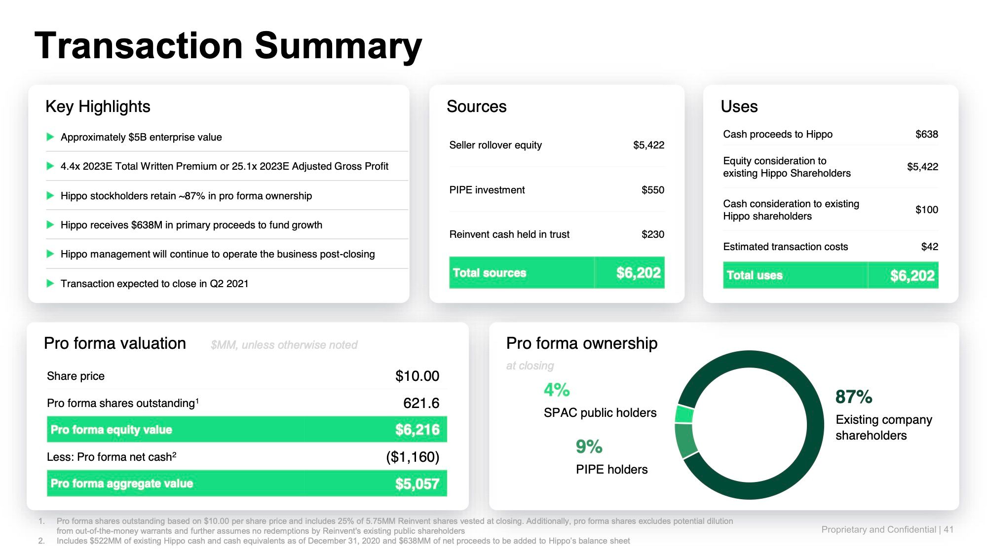 典型的なSPACの合併とは異なり、ReinventとHippoは創業者の株式を2年間ロックアップすることに合意した、と声明は述べている。ピッチデックによると、Hippoの上級経営陣と重要な既存投資家もロックアップの対象となる。Reinventの別会社は、第2四半期に合併するJoby Aviationに対し、一定の株価を達成するまで、経営陣は株を売れない制約を課している。