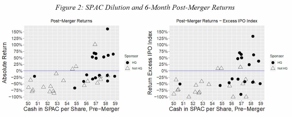 この翻訳記事が説明するように、中央値的なSPACは、逆合併の対象企業と公開市場の投資家にフェアではないが、このHippoの案件はフェアなものであり、下図の左で、Absolute Return(絶対リターン)プラスに転じる分布に含まれるものへの類似性を指摘することはできる。