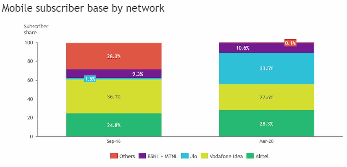4年間でJioは約3億8800万人の顧客を獲得した。Jioが提供した格安データプランはインド人にもてはやされ、インドのデジタル化は急加速した。インド人は2014年の約90MBから2019年には月平均12GBのデータを使用していた。現在、インドは世界第2位のオンライン市場となっている。これらはすべて、主にJioの後ろ盾により起こった。