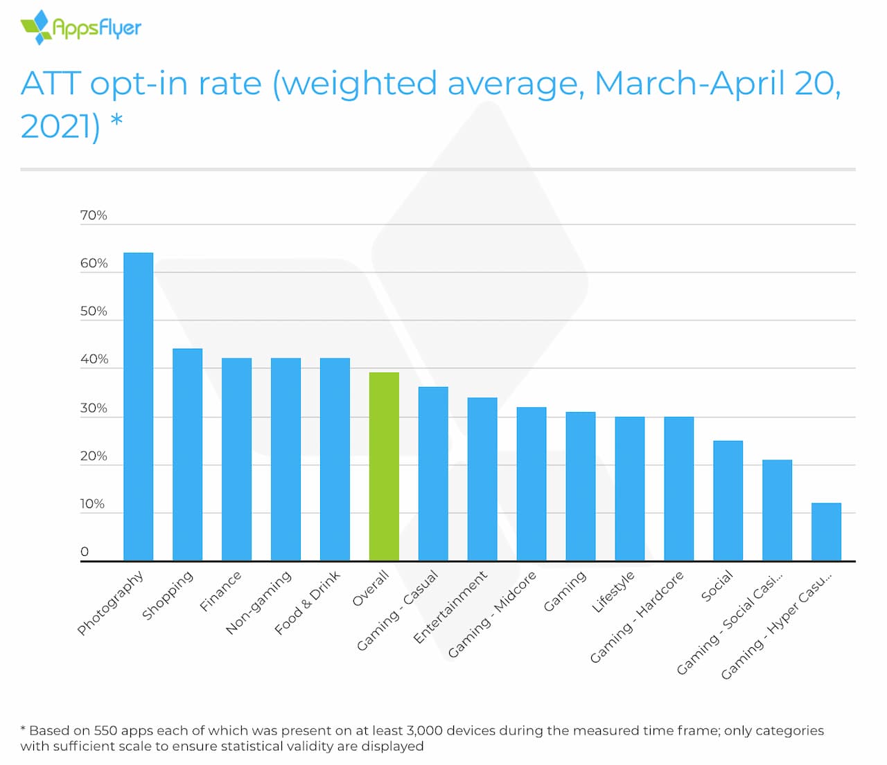 アドテクノロジー企業であるAppsFlyerの調査によると、iPhoneユーザーがショッピングアプリや金融アプリからのトラッキングに同意する割合は40%以上であるのに対し、カジュアルゲームアプリからのトラッキングに同意する割合は12%となっている。オプトイン率(トラッキング許可率)は、ほとんどの場合が1ケタ台になると予想されたが、実際には予想以上に高かったと同社のShani Rosenfelderはブログで書いている。