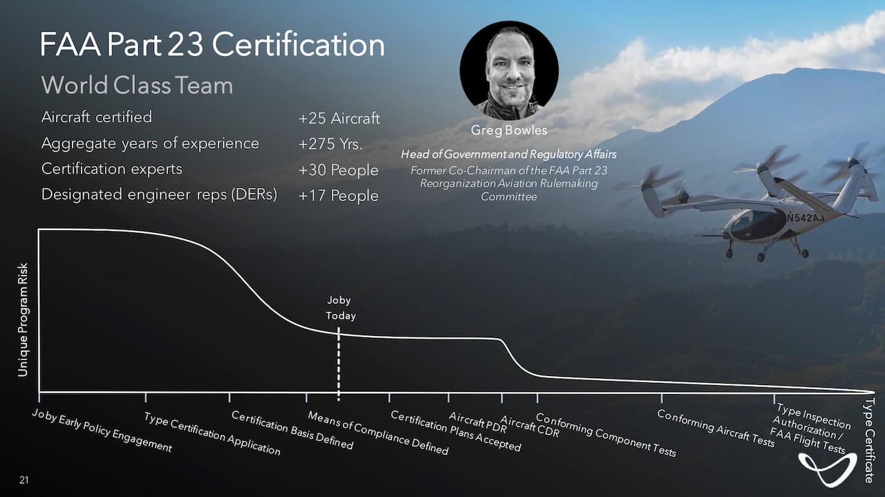 Jobyの認可スケジュールは、2023年にFAAの型式認可を完了することを目指している。Jobyは航空機が統一されたフライトコントロールのバージョンで認可された「Part 23」を満たした最初の航空機となり、小型航空機の配車サービスを開始する計画。