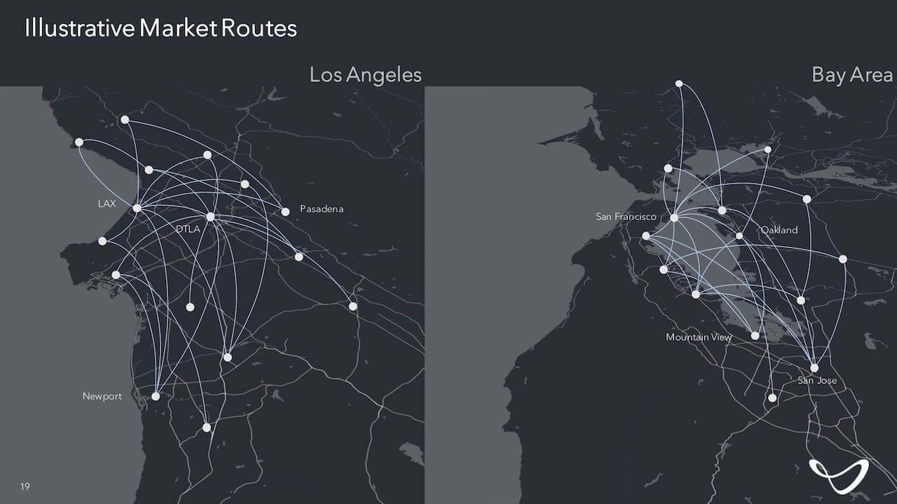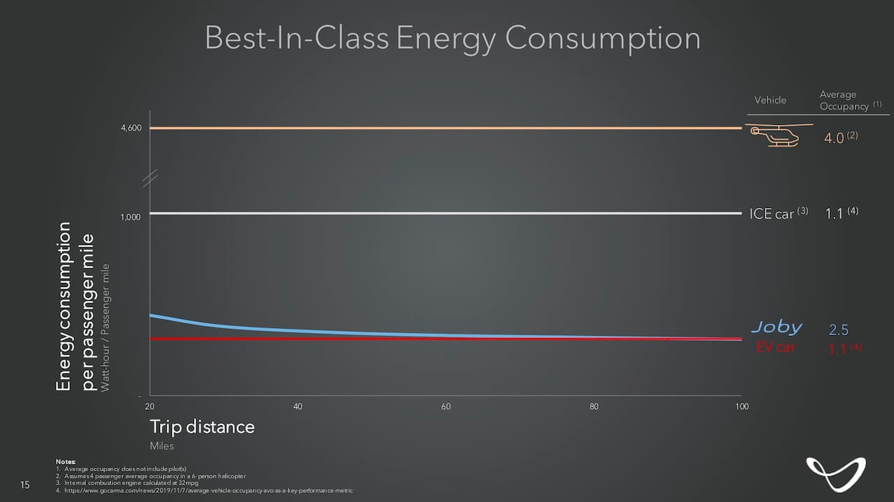 例えば、ロサンゼルス空港からニューポートビーチまでの44マイルの距離を、約1時間15分運転する代わりに、Jobyの航空機を使えば、稼働中の排出ガスをゼロにしてわずか15分で到着することができるとJobyは主張している。