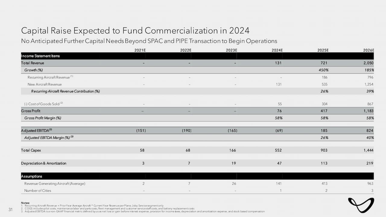 Jobyが最初に収益を上げる年は2024年と予想されている。同社は2026年末までには収益を20億ドルに成長させ、2024年比で1,465%の成長を目指している。売上総利益率(Gross porfit margin)は2024年以降、58%と高水準を維持すると見込むが、その根拠は、eVTOLを製造し、タクシーサービスと販売の両方をすべて自社で行う垂直統合型の事業体系によるものと説明されている。