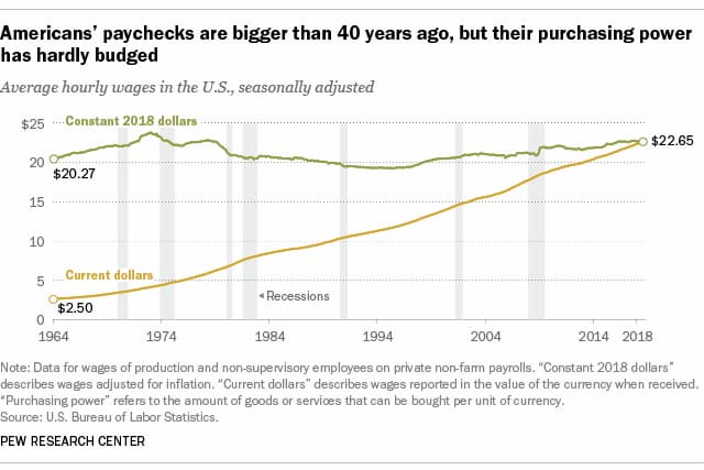 - Drew Desilver. For most U.S. workers, real wages have barely budged in decades. Aug, 2018.