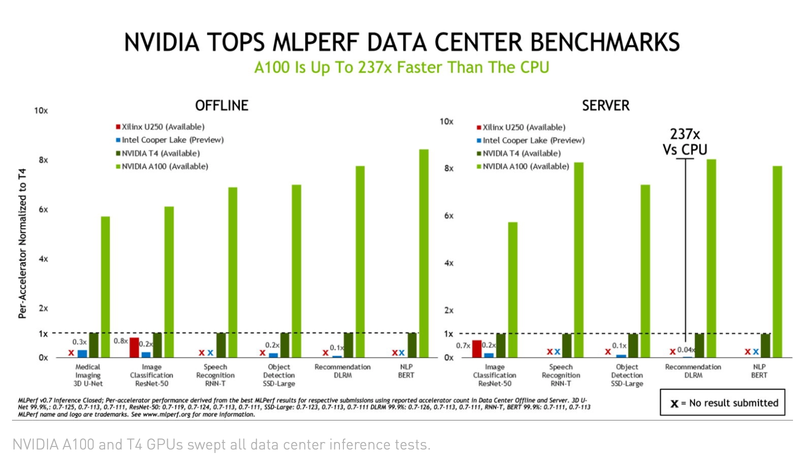 Nvidiaは、メディア向けのブリーフィングと、その後のParesh Kharyaのブログで、アクセラレーションシステムの製品管理担当シニアディレクターがこの結果を誇示した。A100 GPUは、オープンデータセンターのカテゴリではCPUベースのシステムよりも最大237倍高速で、同社のJetson AGXビデオ解析システムとT4チップは、電力に敏感なエッジカテゴリでも優れたパフォーマンスを発揮したとNvidiaは報告している。