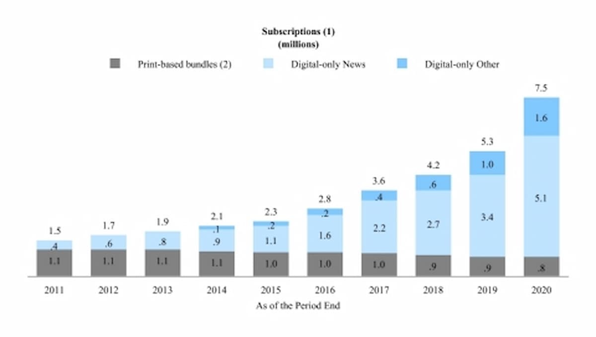 2020年にデジタルのみ(Digital-Only)の購読者数を230万人増やし、デジタル製品と印刷新聞の購読者数が750万人を超えた、と第4四半期報告書は述べている。