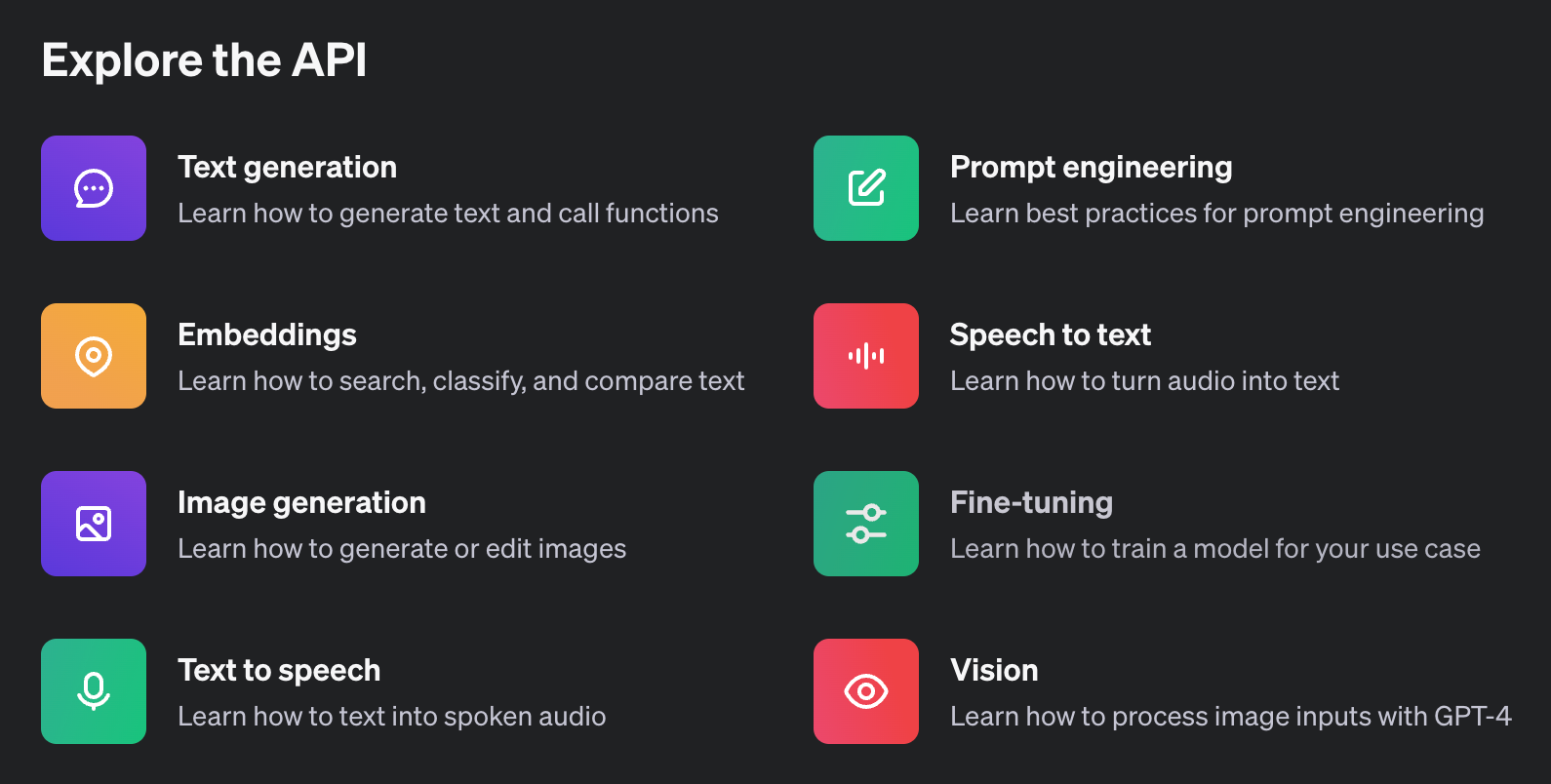 同社はChatGPTやGPTを含む各種API(下図)の初期の市場参入に関しては、かなりスリムな営業・マーケティング組織でこれを実現することに成功したようだ。AIのセンセーションはビジネス界の注目を集めるのに寄与し、恐ろしく効率的なサブスクライバーやAPI利用者の獲得を助けた。これは、B2Bの要素を含む製品の市場参入戦略として、あまりにも画期的なことだった。