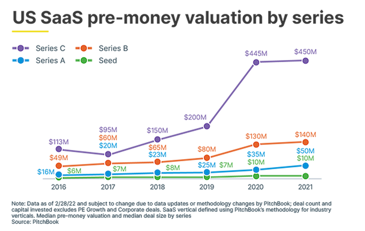 後発のSaaSスタートアップがどれほどのダメージを受けるかは、今になって明らかになりつつある。2021年、激しい競争により、シリーズCのバリュエーションは2倍以上となり、過去最高のバリュエーションとなった。2022年の情勢が変化する中、投資家はどこで、どの段階で資本を投下したいかを再検討している。