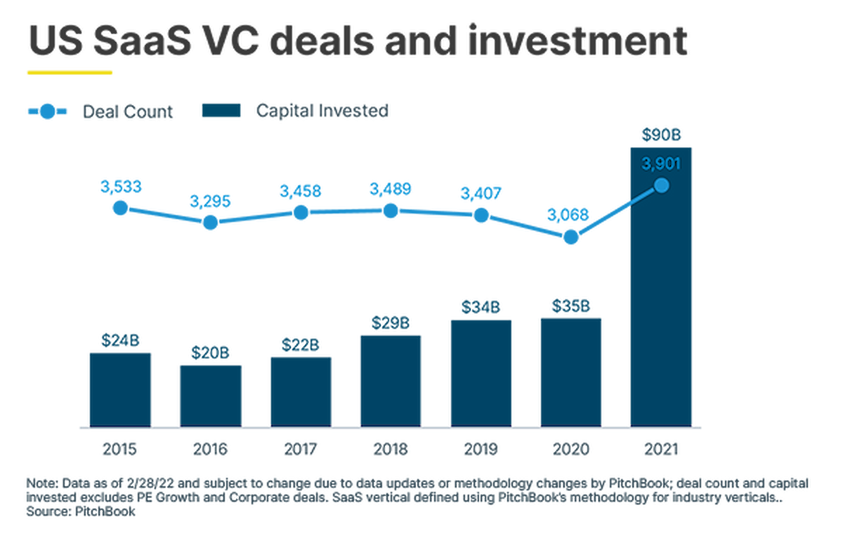 SVBの調査によると、リモート・デューデリジェンスの普及や競争の激化などの要因によって、2021年の米国のSaaS VC投資は3,901件のディールに分散して900億ドルに到達した。1億ドル以上の米国SaaS VCディールは263件を超え、昨年の3倍、2015年の7倍となった。
