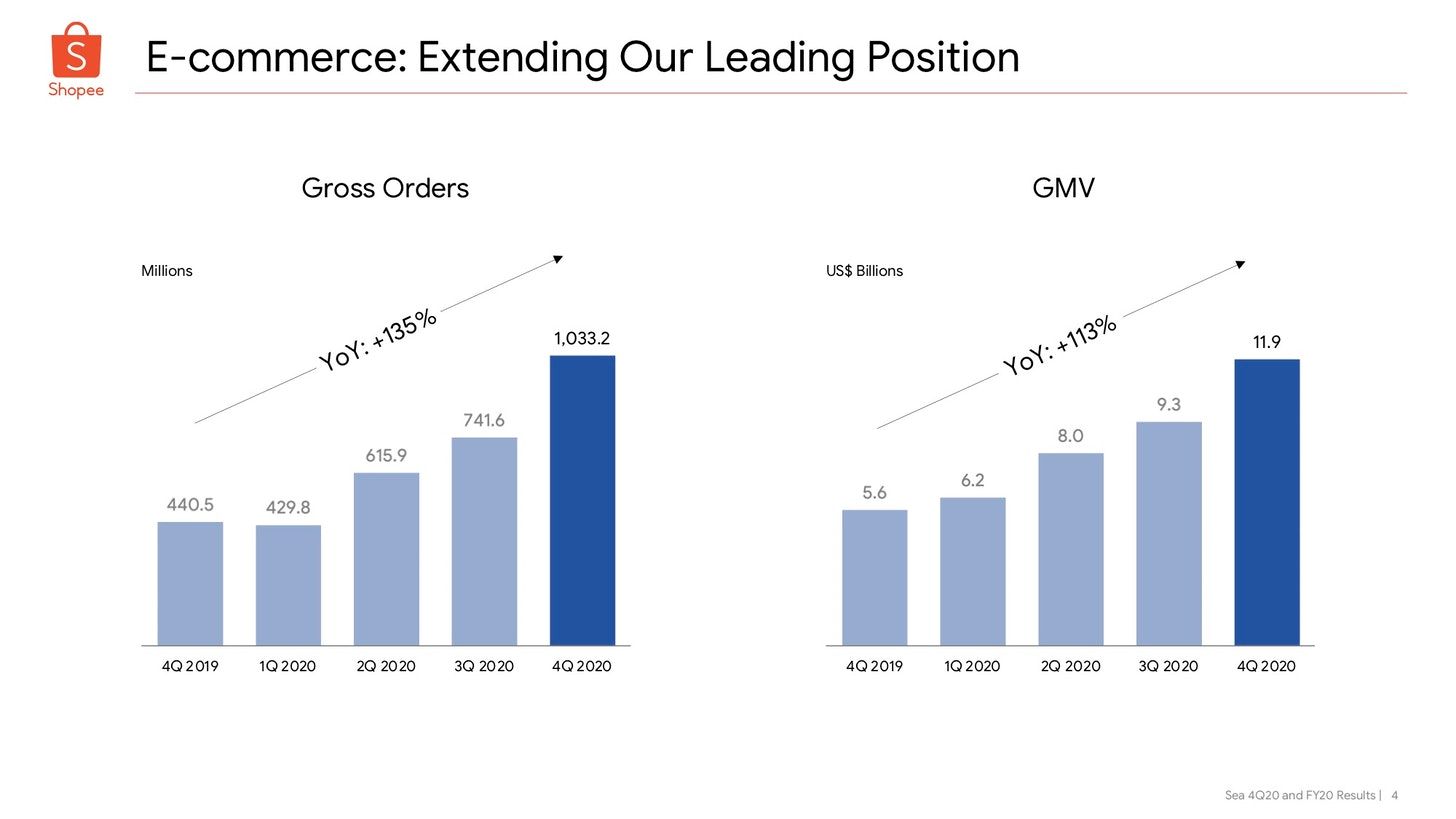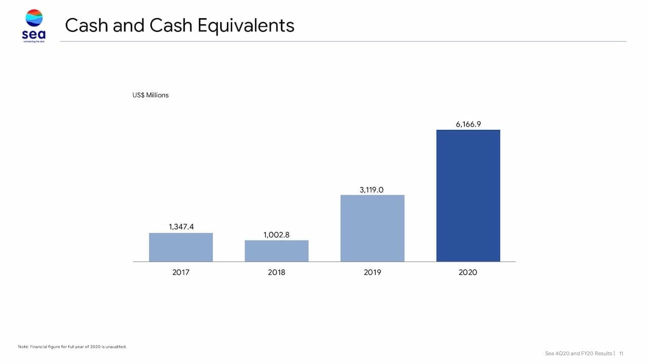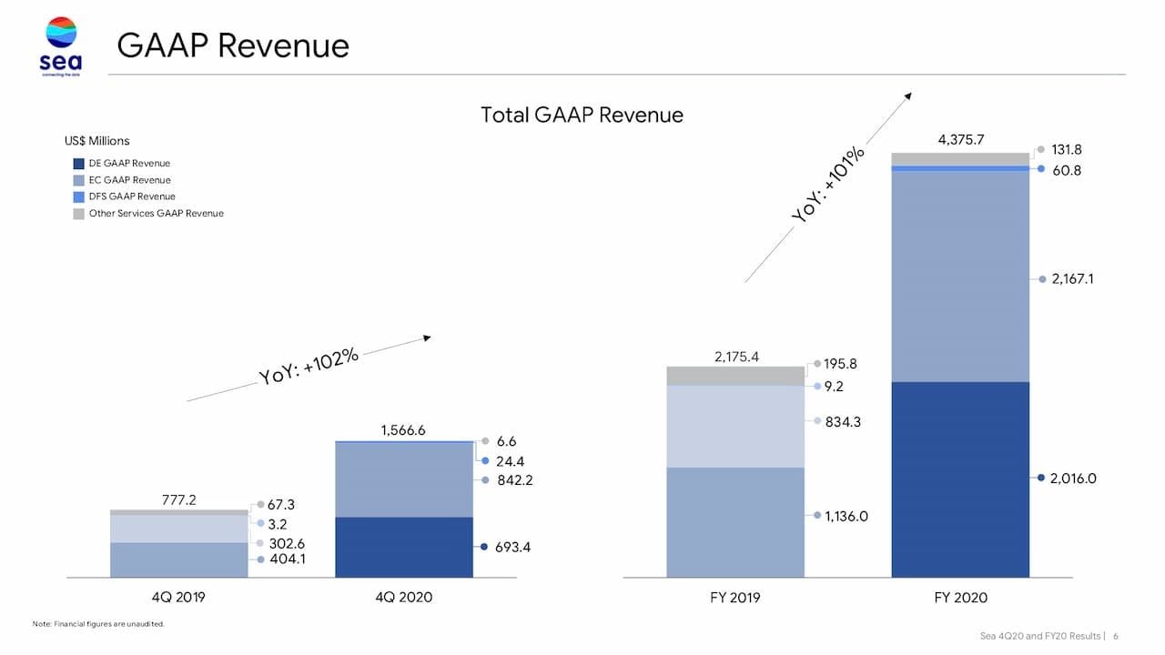このような東南アジアのインターネット経済の成長を一身に享受しているのが、Sea Limitedだ。2020年第4四半期、GAAP売上高は前年同期比102%成長し、15億6,660万ドルに達している。通年では、GAAP売上高は前年同期比101%の43億7,570万ドルに達した。Googleらの報告書によると、地域のインターネット経済は2020年の間停滞していたはずだが、同社の成長は止まっていない。