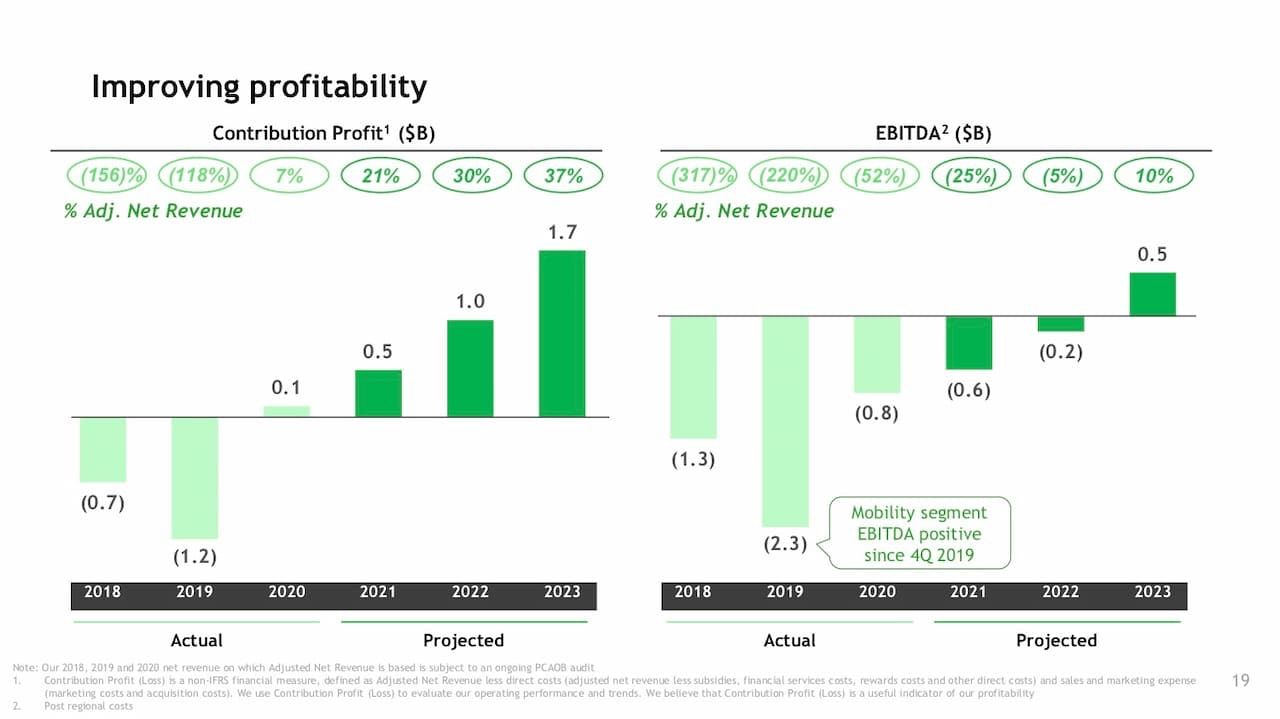 SPAC上場のため、十分な情報はもたらされないが、Grabは投資家向けのスライドで楽観的ともとれる見通しを示している。GMVは年平均成長率(CAGR)40%で成長すると想定され、純収益(Net Revenue)はCAGR42%で成長すると想定されている(図1)。この楽観的な見通しをもっても5億ドルの黒字に到達するのに2023年までかかるとGrabなどは予測している(図2)。