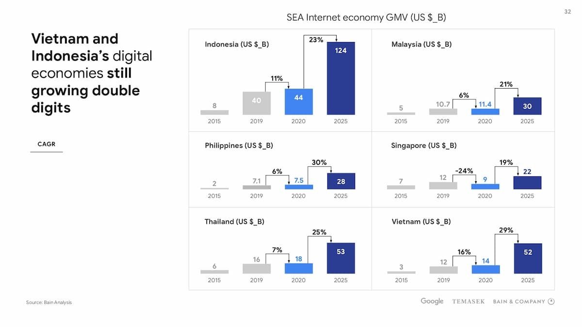 インドネシアはこの調査の対象となった東南アジアの主要6カ国のインターネット経済の約6割を占めている。コロナ禍の間でも、インドネシアとベトナムのインターネットエコノミーGMVは二桁の成長を持続させている。