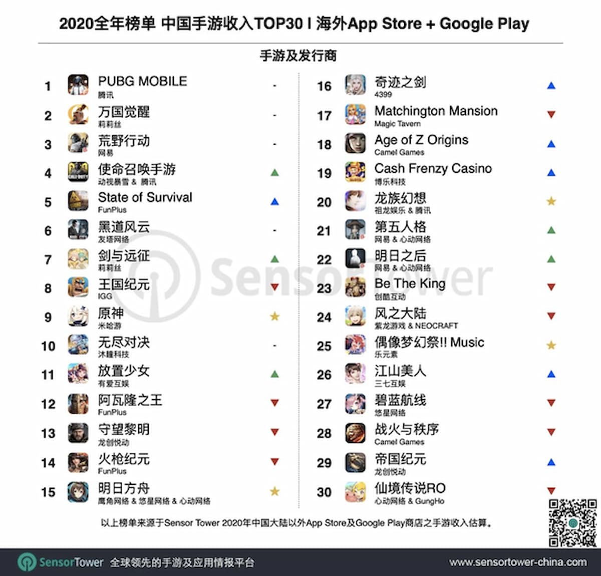Sensor Towerの最新レポートによると、2020年には中国のモバイルゲーム37作品が海外市場で1億ドル以上の収益を上げていることが明らかになった。App StoreやGoogle Playで最も稼いだゲームの上位30作品の総収入は92.4億ドルに達し、2019年の63億ドルから47%増加した。