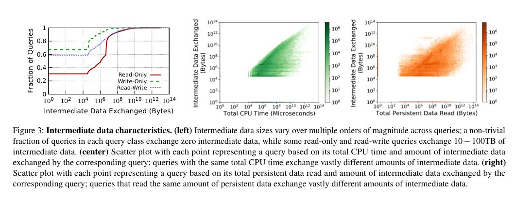 - 中間データのサイズは、クエリによっては数百ギガバイトから数テラバイトの中間データを交換するクエリもある。クエリによって生成される中間データの量は、クエリによって読み込まれる永続的なデータの量やクエリの実行時間とはほとんど相関関係がある。
