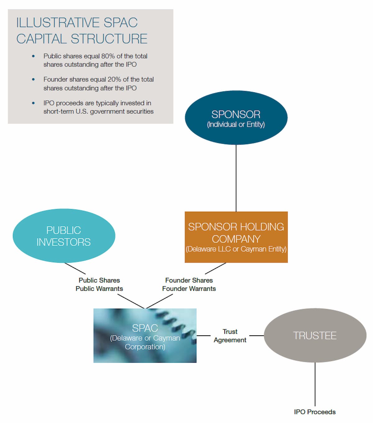 SPACは、米国証券取引委員会(SEC)に登録書を提出し、SECのコメントをクリアし、堅実なコミットメントの引受に続くロードショーを実施するという典型的なIPOプロセスを経ることになる。IPO収益は、企業結合のための資金として放出されるか、またはIPOで売却された株式の償還に使用されるまで、信託口座に保管される。引受割引の前払い分を含む公募費用、および少額の運転資金は、SPAC を形成する事業体または経営陣(「スポンサー」)によって賄われる。IPO 後、SPAC は買収の機会を追求し、事業や資産を買収するための合併や売買契約を交渉する(「企業結合」[Business Combination] と呼ばれる)。SPACが企業結合を追求したり、その他の費用を支払うために追加の資金が必要な場合、スポンサーはSPACに追加の資金を貸与したりすることがある。SPACは、買収契約に署名する前に、企業結合のための購入価格の一部を調達するために、私募増資(PIPE)のようなコミットメント・デットまたはエクイティ・ファイナンスを手配することがよくある。