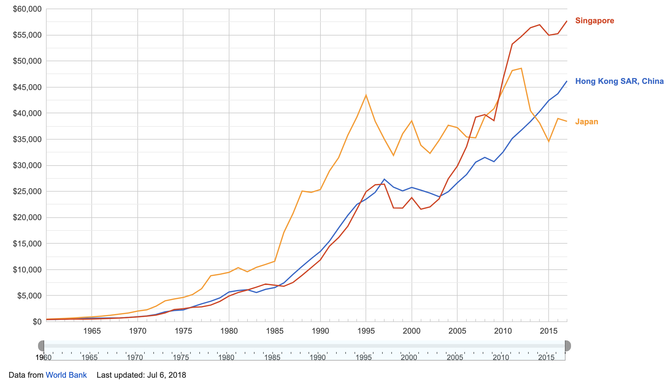 インターネットが進化させた経済社会では、障壁が減り、様々な事象の拡張可能性が広がるため、高度技能者が経済に付加する価値が拡大しやすいと考えられる。言い換えると、労働力の多数を高度技能者に転換している経済は高いパフォーマンスを発揮する傾向が高いということだ。東南アジアではシンガポールはその傾向が顕著であり、同国の一人あたりGDPは5万7714ドルに達している。