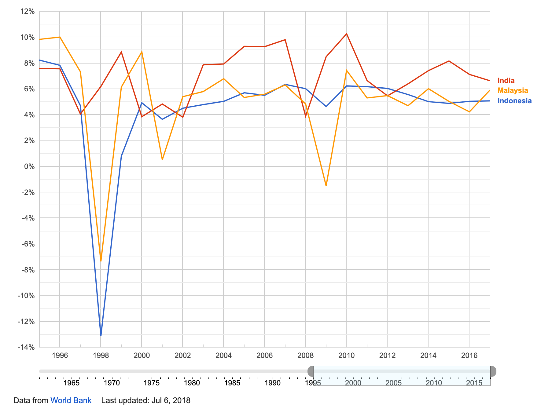 世界銀行の「June 2019 Indonesia Economic Quarterly: Oceans of Opportunity」によると、インドネシアのGDP成長率は2019年第1四半期に5.1%と概ね安定していた。安定した経済成長を維持しており、過去14四半期一貫して4.9〜5.3%の狭い範囲で推移している。