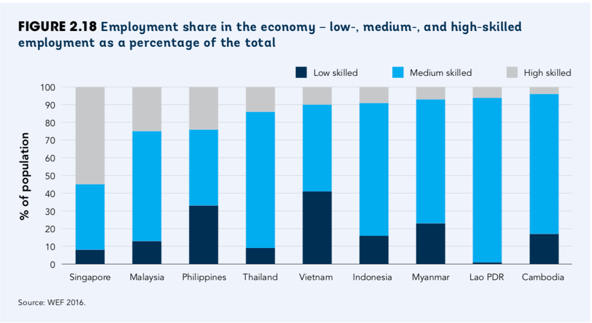 それ以外の国がこの高度技能者を増やし、技能を得る機会に乏しい人材の割合を減らせるかが、東南アジアのデジタル革命の鍵となる。概して現状の教育や労働市場の状況は余り好ましい状況とは言えず、より大掛かりな投資と制度設計が必要になると考えられる。