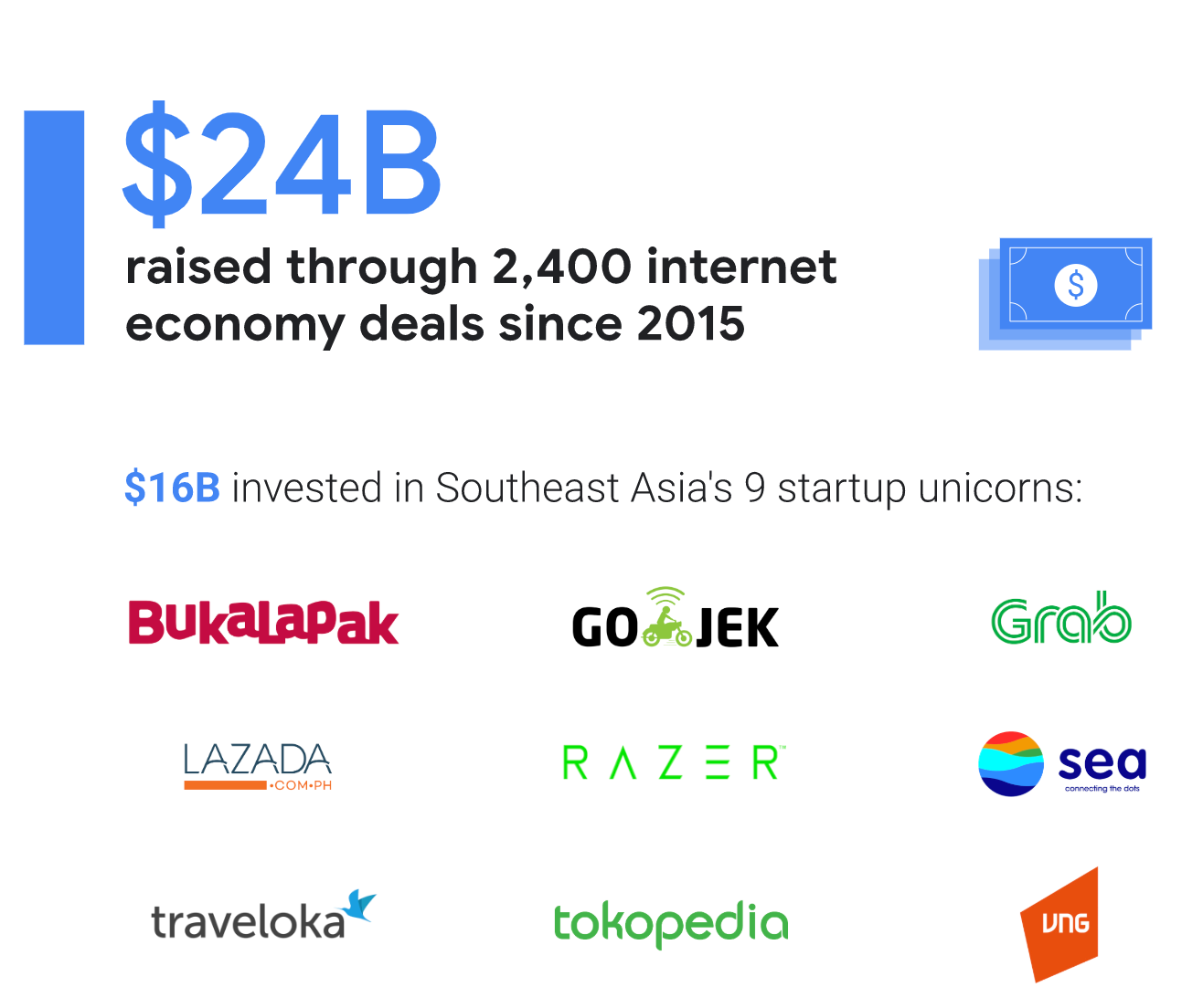 240億ドルを集めているスタートアップの代表例はBukalapak, Go-Jek, Grab, Lazada, Razer, Sea Group, Traveloka, Tokopedia, VNGなどである。