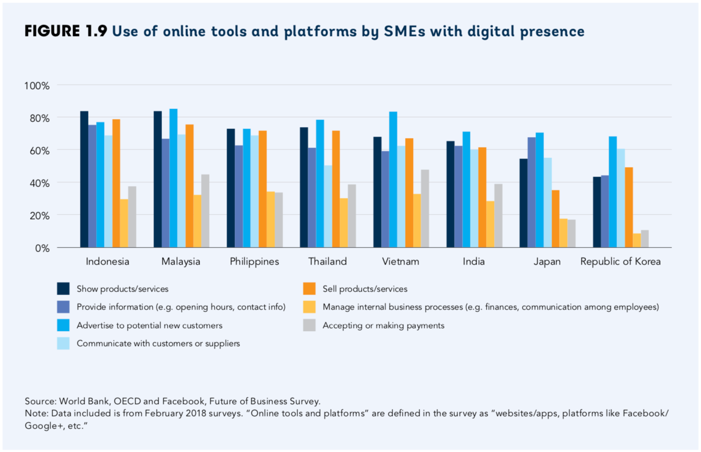 デジタル革命の影響は、いくつかの著名なソーシャルネットワーキング、オンラインビジネス、またはモバイルアプリに限定されない。中小企業のオンラインツールの活用状況では、東南アジア諸国が日本、韓国、インドに優越している。