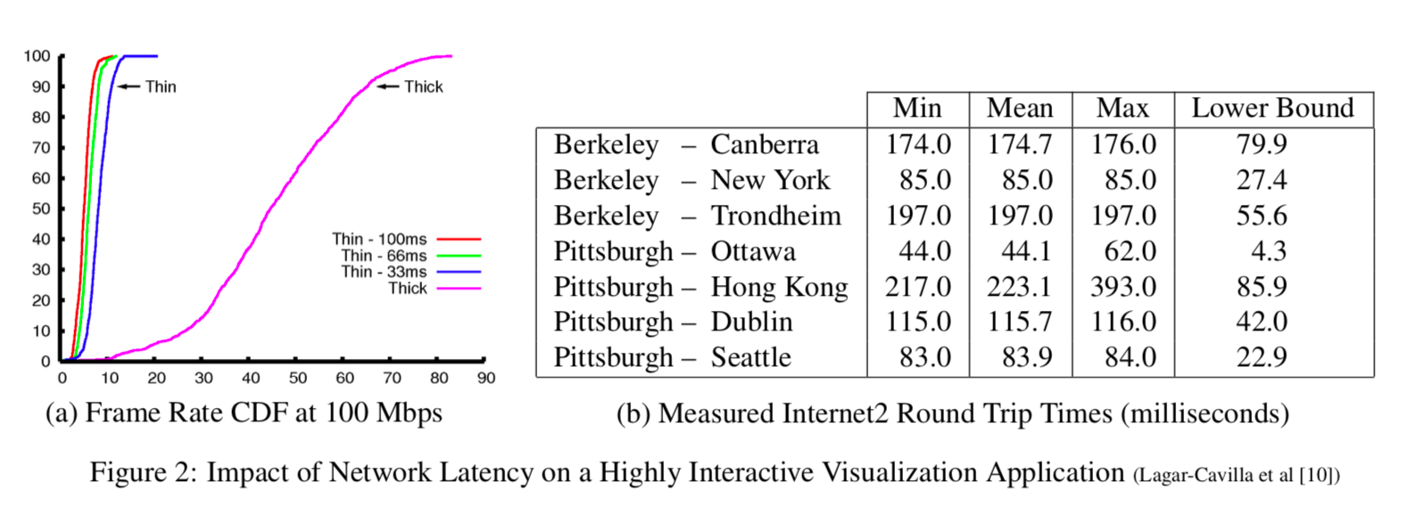 Lagar-Cavillaらは、高速な帯域幅にもかかわらず、遅延がインタラクティブなレスポンスに悪影響を与えることを示しています。図2(a)は、可視化アプリケーションQuake Vizによって測定された出力フレームレートを2つの異なる構成で比較しています。ハードウェアグラフィックスアクセラレーションを備えたローカルマシン(Thick)と、VNCを介して出力を表示する100 Mb/sのネットワーク上にあるコンピュートサーバ(Thin)です。高いフレームレートは、インタラクティブなユーザーに滑らかさを提供しているような錯覚を与えます。