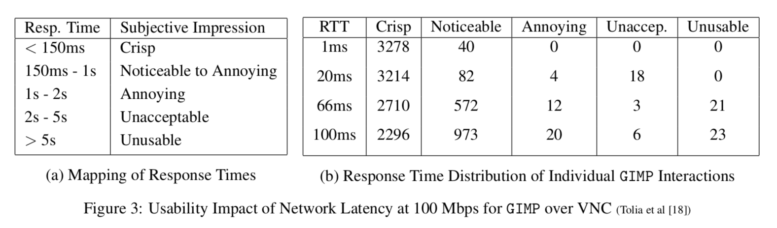 独立して、Toliaらは、シンクライアントのパフォーマンスのユーザーが知覚する品質は非常に多様であり、アプリケーションのインタラクティブ性の程度とネットワークのエンドツーエンドの遅延の両方に依存することを示しています。図3に示すように、写真編集のようなインタラクティブ性の高いタスクのユーザビリティは、中程度のネットワーク遅延(100ミリ秒のRTT)と非常に良い帯域幅(100 Mbps)であっても、容認できないほど低下します。これは、Webブラウジングのようなタスクが対話的に非対応であるのとは対照的です。図3(b)はGIMPの写真編集タスクにおける個々のインタラクションの応答時間の分布を示しています。図3(a) に示された応答時間と品質の主観的な印象との対応付けは、 実証的な研究から生まれた長年にわたって確立されてきた HCIガイドラインに基づいています。