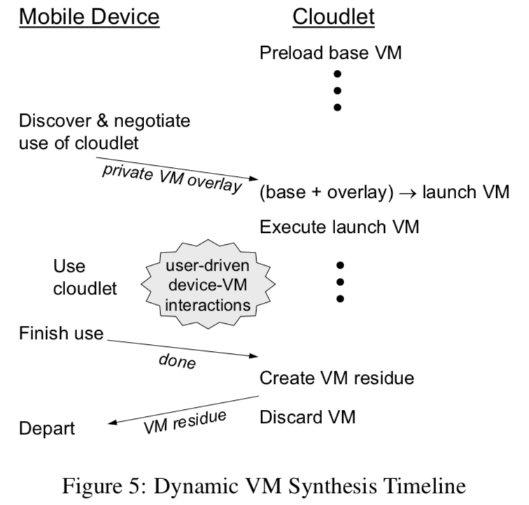 このオーバーレイから派生したベースVMをすでに所有しているクラウドレット・インフラストラクチャに、モバイルデバイスから小さなVMオーバーレイが配信されます。インフラストラクチャは、このオーバーレイをベースに適用して launch VM を導出し、この VM はオーバーレイが導出された正確な状態で実行を開始します。図5にこのアプローチのステップを示します。例えば、ランゲージ翻訳アプリケーションでは、起動VM内のソフトウェアは、モバイルデバイスからキャプチャした音声を受信し、音声認識と言語翻訳を行い、音声合成のために出力を返すサーバになります。クラウドレットがクラスタであれば、Lagar-Cavillaらが述べているように、起動VMを迅速にクローン化して並列性を利用することができます。