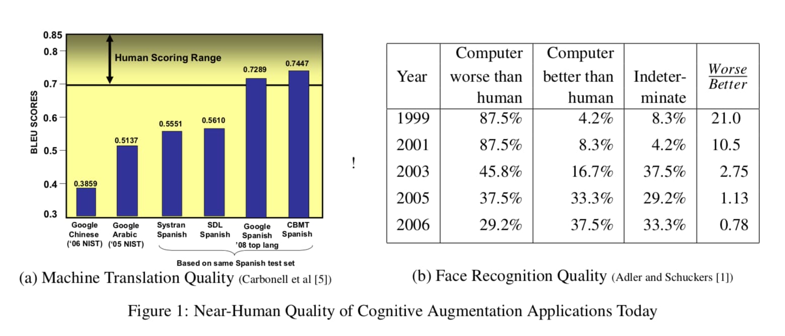 コンピュータビジョンを利用した顔認識は、過去10年間で急速に進歩したもう一つの分野である。図1(b)は、Adler and Schuckerによる2007年の人間と自動翻訳者の顔認識性能の比較を引用したもので、今日ではコンピュータと人間はこのタスクにおいて同等であることを示しています。このような応用分野では、実用化に向けた技術的な改良がまだ必要であるが、将来の可能性を認識するためには大きな飛躍は必要ない。真の課題は、軽量でエネルギー効率が高く、資源に乏しいモバイルハードウェア上で、高度に変化する条件の下で、その最先端の性能と品質を自然界で維持することにあります。
