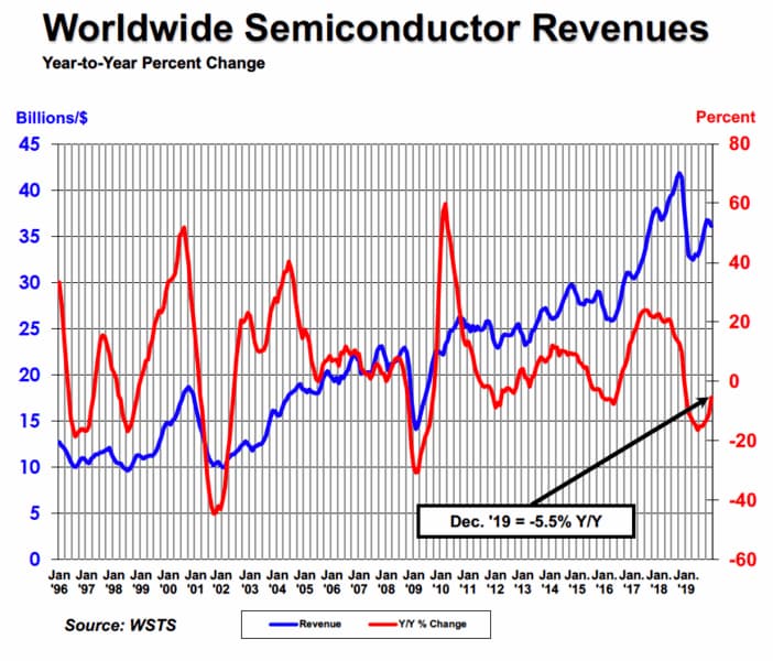 昨年は、半導体メーカーにとって苦労の年でした。半導体業界の世界的な収益は、前年比12%減の4,120億ドルで、2001年のドットコム不況以来最大の減少となっています(米国半導体工業会 = SIA調べ)。Intel、Micron、SK Hynixなどの大手チップメーカーのいくつかは、2018年の第4四半期にチップ価格が下がった後、設備投資を縮小し、これが2019年の低迷に繋がりました。