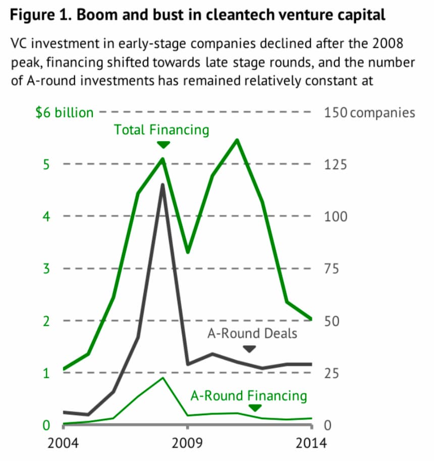 現在ビル・ゲイツのVCであるゲイツ・ベンチャーでダイレクターを務めるベンジャミン・ガディ(Benjamin Gaddy)博士らは2016年の論文『Venture Capital and Cleantech: The Wrong Model for Clean Energy Innovation』で、イノベーションへの投資に意欲的な大企業の不足に特に悩まされているクリーンテック分野では、VCのモデルは破綻していると結論付けた。