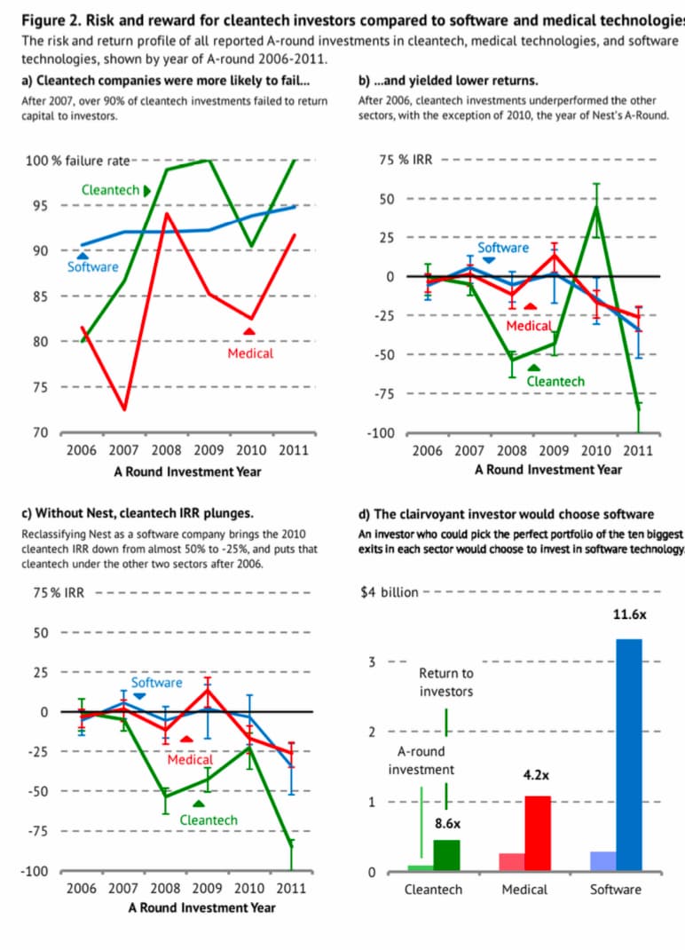 何が問題だったのかを解明するため、ガディらは2006年から2011年までに最初のラウンド(Aラウンド)と呼ばれるVCからの資金調達を受けた医療技術、ソフトウェア技術、クリーンテック企業のパフォーマンスを、公開データを用いて集計した。その結果、クリーンテックの新興企業に賭けても、他のセクターに比べてリスクとリターンのプロファイルを必要とするVCにとっては意味がないことがわかった。特に、新素材、ハードウェア、化学品、プロセスを開発しているクリーンテック企業は、多額の資金を必要とし、開発期間が長く、コモディティ市場での競争力がなく、企業の買収者を引き付けることができないため、VCの投資には向いていなかった。
