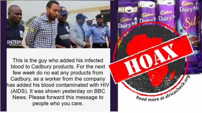 下の画像は、「Viral Media Johor」と呼ばれるインドネシアのWhatsAppグループで広まり、そして後にナイジェリアのグループでも広まりました。画像には「この男はHIVウィルスに汚染された血液をお菓子に入れました。これは昨日BBCニュースの報道の画像です。あなたが大切に思う人に転送してください」と書かれています。画像は後にフェイクニュースだと判明しました。