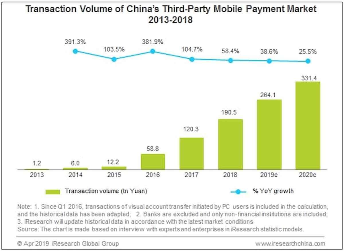 iResearchによると、中国での第三者決済取引の規模は過去5年間で急速に拡大している。 特に第三者モバイル決済取引は2015年以降急速に成長し、2016年の58.8兆元(約8.3兆ドル)から2017年の120.3兆元に、年率104%近くで増加している。2018年には190兆元以上である(下の図3は”モバイル”第三者決済取引の規模の推移)。